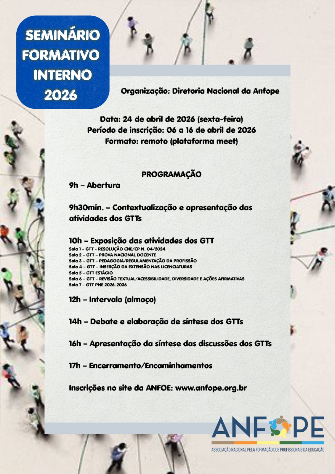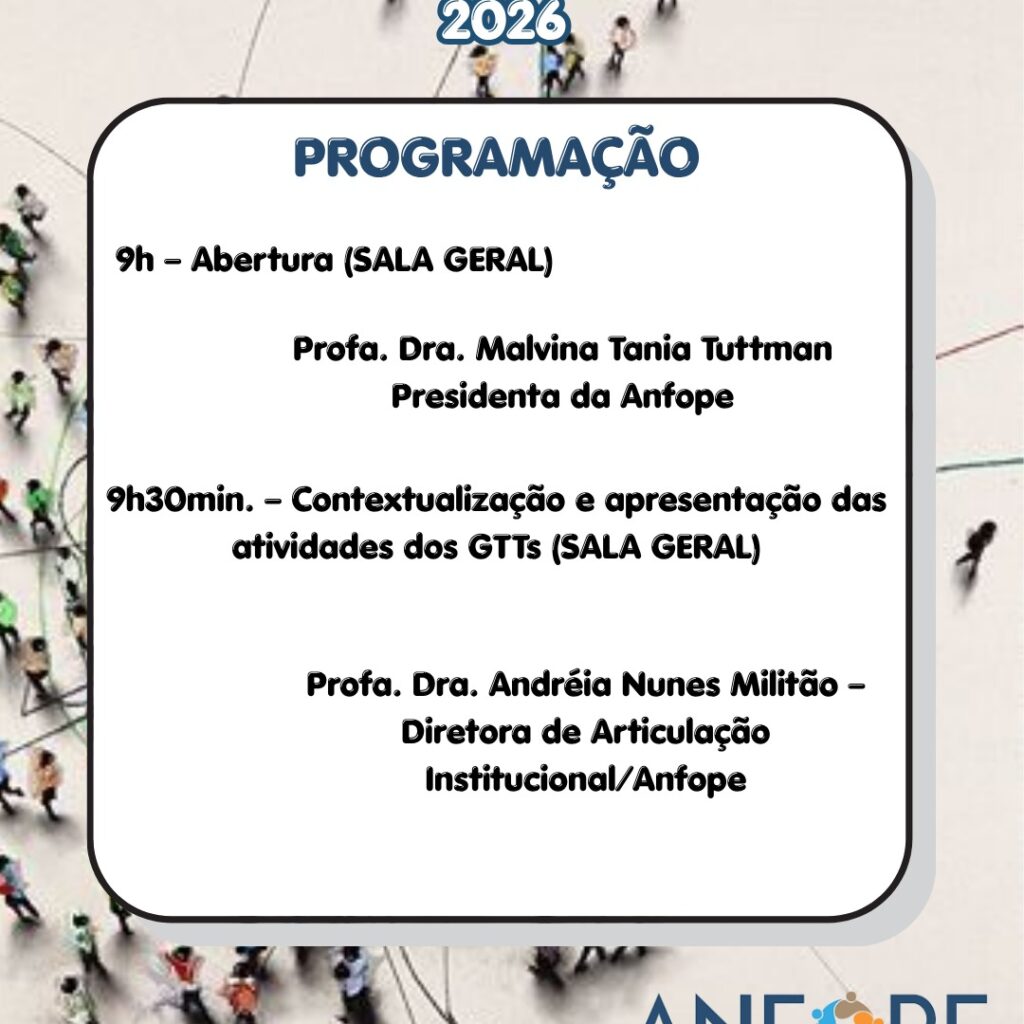 A Diretoria Nacional da ANFOPE convida todos/as os/as associados/as para o nosso Seminário Interno, que acontecerá no dia 24 de abril (sexta-feira). O encontro será realizado de forma remota via plataforma Meet, facilitando a participação de todos.